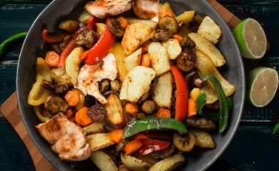 Lomo, pechuga, cebolla, pimiento, salsa chimichurri y patatas.